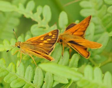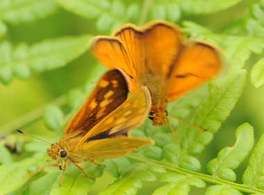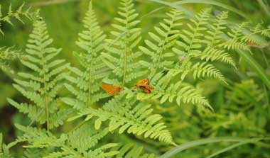 (参考) 求愛 2014年7月6日 山梨県の高原 この日は多くのコキマダラセセリを見ました。求愛シーンは一度だけでしたが、シダ葉上で数分続いた後飛び去りました。♂は♀の周りを飛んだり静止したり、また翅を細かく震わせていることも多かったです。 トップページへ |