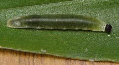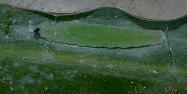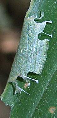 (参考) 幼虫(3齢?)と巣 2011年10月9日 京都市山科区 クロセセリは東は大津市まで広がっているようですが、ここは大津市に近い京都市山科区の畑です。親戚の畑ですが、ときどきクロセセリの幼虫を見ることができます。この幼虫は脱皮直前で巣を開けてしまったようで、心配です。 トップページへ |