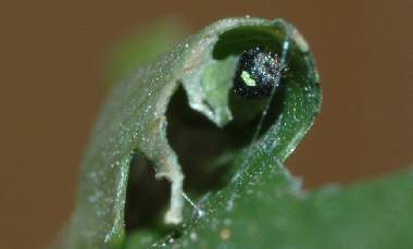 (参考) 幼虫の営巣(2齢?) 2007年8月11日 京都市北区 産 大阪市淀川区 飼育 巣を開くとすぐに修復を始めます。頭部には葉の一部がくっついて模様のように見えます。 トップページへ |
