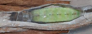 (参考) 蛹(羽化前兆) 2007年8月27日 京都市北区 産 大阪市淀川区 飼育 黒く色づきました。翌日羽化しましたが、枯れたミョウガの葉が蛹に食い込んで、脱出できず、ピンセットで出して蛹殻を壊して出してあげましたが、羽を伸ばすことができませんでした。枯れた葉には気を付け、事前に除去しておかなければなりません。 トップページへ |