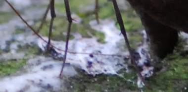 (参考) 吸汁(鳥糞、吸い戻し) 2007年9月23日 京都市北区 セセリに特有の吸い戻しという行動です。乾固した鳥糞を、尾端から水滴を出して溶かし、それを吸っていると思われます。ただし水滴は確認できませんでした。 トップページへ |