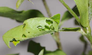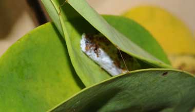 (参考) 眠に入ったタイワンアオバセセリの幼虫と巣(2齢、9.2mm)、幼虫の付いていたアセロラ 2015年5月12日 撮影 静岡市駿河区 飼育 沖縄県石垣島 採幼(byH氏) 幼虫を入手した時の様子です。巣を開けて幼虫の様子を撮影しました。もうすぐ3齢になろうとしています。アセロラには大小4匹の幼虫がいました。ここに示すのは最も幼かった幼虫です。 トップページへ |