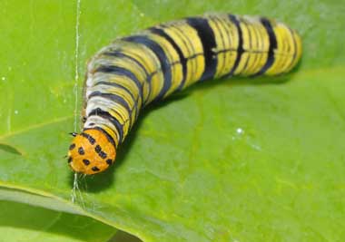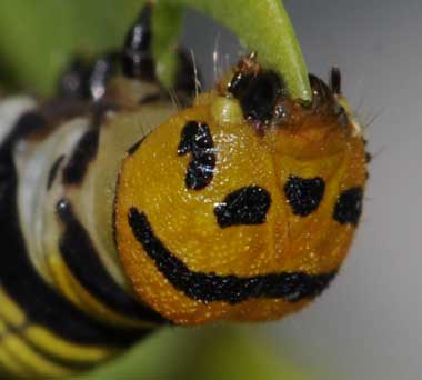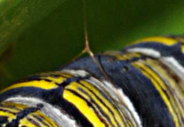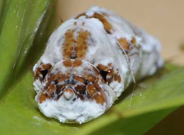 (参考) 営巣中のタイワンアオバセセリの幼虫(5齢、46.5mm、コウシュンカズラ)、頭部と背中の模様 2015年5月21日 撮影 静岡市駿河区 飼育 沖縄県石垣島 産 あいかわらず成長は非常に速いです。固そうなコウシュンカズラの葉の両側に糸を何往復も渡して折り曲げて巣を作っています。頭部の模様はアオバセセリに似ています。テントウムシに擬態していると言われています。 トップページへ |