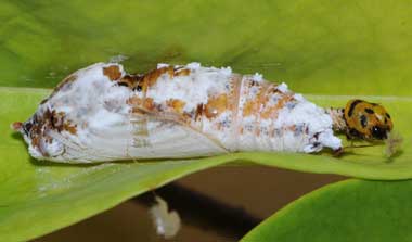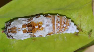 (参考) タイワンアオバセセリの蛹(26mm) 2015年5月28日 撮影 静岡市駿河区 飼育 沖縄県石垣島 産 前蛹を撮影した夜には蛹化していました。これはその2日後の様子です。アオバセセリのように真っ白にはなりませんでしたが、白い粉をまとっています。 トップページへ |