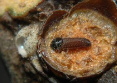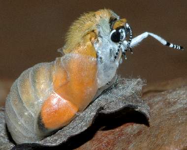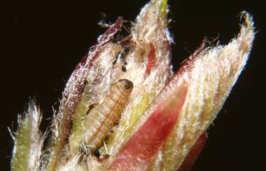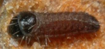 幼虫(2齢、5mm) 2006年3月28日 兵庫県猪名川町産 大阪市淀川区飼育 摂食時以外は、このようなところに隠れています。 トップページへ |