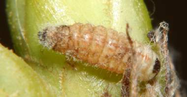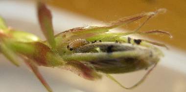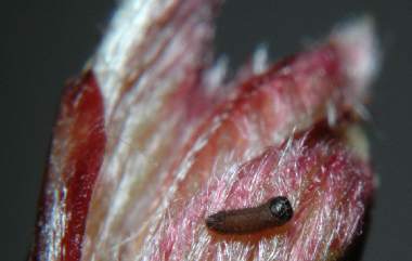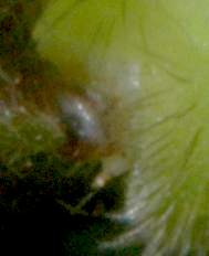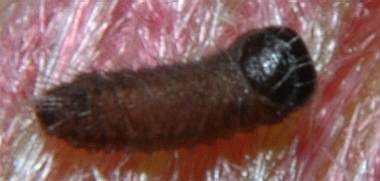 幼虫(1齢、2mm) 2006年3月19日 兵庫県猪名川町産 大阪市淀川区飼育 糞があるので、大丈夫だとは思うのですが、どうしても気になるので、アラカシの芽を少しピンセットで剥いてみました。かなり太って、孵化したときとは大部様子の異なる幼虫が出てきましたが、1齢だと思います。 トップページへ |