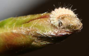 幼虫(2齢、3mm) 2006年3月26日 兵庫県猪名川町産 大阪市淀川区飼育 2日ぶりに生き返りました。本当にうれしかった。無事脱皮し、今まで食べていなかった芽に食いついています。模様も明瞭になりました。毛もずっと長いです。 トップページへ |