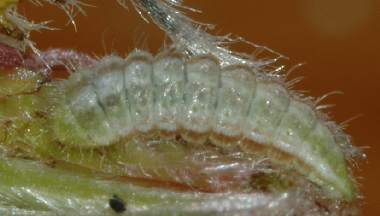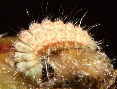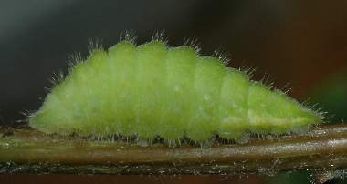 幼虫(3齢?、7mm) 2006年4月1日 兵庫県猪名川町産 大阪市淀川区飼育 おそらく、3齢になったものと思われます。他のゼフィルスより、背が高い気がします。アラカシの若葉の色に合わせて、薄い緑と赤が混じった色になっています。 トップページへ |