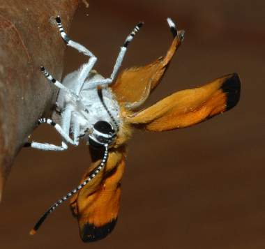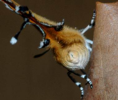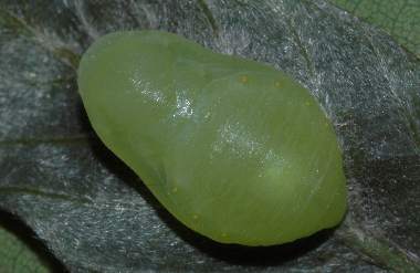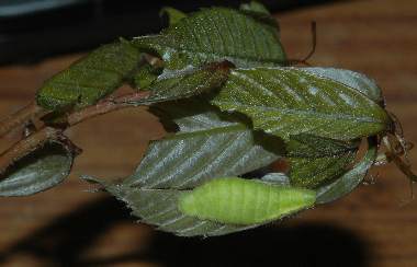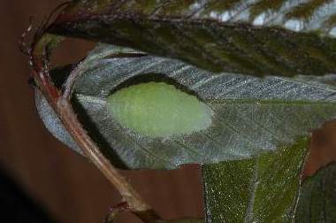 蛹と羽化後まもなくの成虫(♀) (蛹) 2006年4月25日07:59am 2006年4月25日23:58 (成虫) 2006年4月26日21:02 兵庫県猪名川町産 大阪市淀川区飼育 羽化前兆初期には、何か妖精を思わせる雰囲気で神秘的です。羽化前兆を確認してから、あっという間の羽化でした。後翅の端はめくれていますが、これは触角と合わせて何かの顔への擬態のようです。 |