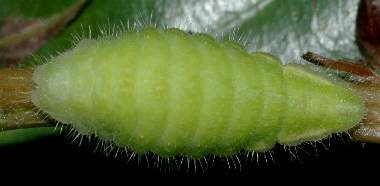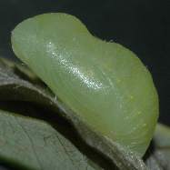 蛹化間近のアカシジミの幼虫の休息(4齢、17mm) 2006年4月10日 兵庫県猪名川町産 大阪市淀川区飼育 きれいな薄緑色で、かなり盛り上がった感じの幼虫です トップページへ |