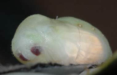 前蛹 2006年4月12日 兵庫県猪名川町産 大阪市淀川区飼育 前日から、葉の裏で動かなくなり、今日糸をかけて完全に前蛹になりました。右が頭。 トップページへ |