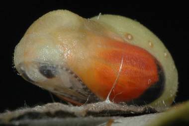 幼虫(孵化直後) 2006年3月16日 兵庫県猪名川町産 大阪市淀川区飼育 3月11日の朝、冷蔵庫から出して居間に置き(20℃前後)、3日目ぐらいには穴が開きましたが、それからほとんど穴が広がりません。ルーペで見ると幼虫の頭が動くのが見えます。このままでは力が足りずに死亡するという恐れで、カミソリの刃を使って穴の周りを薄く切り取りました(3月16日、7:15am)。中の幼虫ははっきり見えましたが、あまり動く様子もなく会社に行きました。そして、夜の9時過ぎに見ると、近くに鎮座していました。アラカシの芽を与えたところ、少し糞をしているようで、一安心です。 トップページへ |