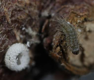 眠に入ったアサマシジミの幼虫と脱皮後まもない幼虫(3齢→4齢、7.5mm、ナンテンハギ)
