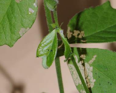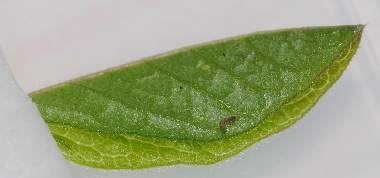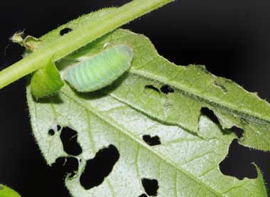 2013年3月25、27日 撮影 静岡市駿河区 飼育 長野県小諸市 H氏 母蝶採集、採卵 ネット情報で、代替食としてカラスノエンドウ(別名ヤハズエンドウ)を利用するというのがあったので、喜んで与えてみました。カラスノエンドウはナンテンハギと同じソラマメ属です。すると、孵化幼虫3匹のうち1匹だけが食いついて、少しずつ成長していました。しかし、同時にナンテンハギで飼育している個体に比べると成長速度はずっと遅く、結局2齢になることなく死亡しました。産地か齢数かによって利用できるかどうか変わるのでしょう。非常に残念です。 トップページへ |