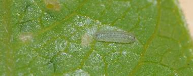 脱皮後少し成長したアサマシジミの幼虫(2齢、4.4mm、ナンテンハギ)