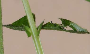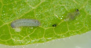 カラスノエンドウを食べる幼虫(1齢)と食痕