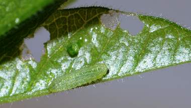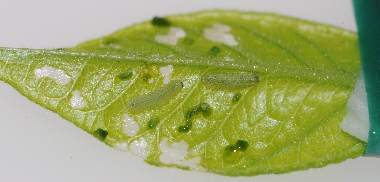 孵化後成長した摂食中の幼虫(1齢、2.3mm、ナンテンハギ)と食痕
