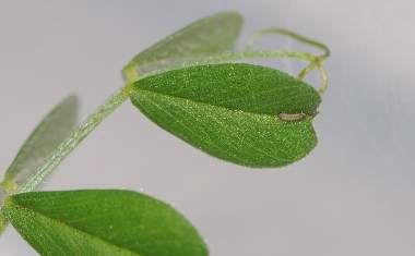 孵化直後間もないアサマシジミの幼虫(1齢、1.3mm、ナンテンハギ)と食痕