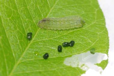 脱皮後成長した幼虫(2齢、4.0mm、ナンテンハギ)、食痕、糞