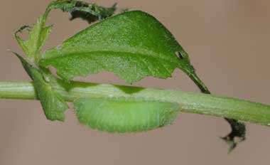 ![]() ↑4月6日、2齢、4.5mm ![]() ↑4月8日、3齢、4.5mm、葉の基部に脱いだ皮が見える。 ![]() |