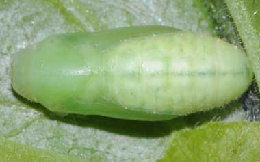 2015年4月19、25日 撮影 静岡市駿河区 飼育 長野県 ?氏 母蝶採集、採卵 個体4:2013年の飼育時に、Web情報にカラスノエンドウで良好に生育というのがあり、孵化後から与えたところほとんど食いつかず、1匹だけ食いついたものの死亡しました。今年はナンテンハギで無事に育ったのですが、餌不足状態になって、終齢なら大丈夫かもしれないと思い、終齢脱皮して2日目ぐらいでカラスノエンドウを与えてみました。しばらくウロウロしていたのですがまず開く前の葉を食べ、その後またウロウロしたのちに花を食べ始めました。その後はずっと花しか食べず、容器をウロウロすこともありましたが、このところ落ち着いて開く前の葉や花を食べています。開いた葉や実は全く食べません。それでも順調に育っています。しかし残念ながらその後死亡しました。容器で飼ったことが悪かったのか、最後に与えた草になにか薬が付いていたのか、カラスノエンドウが悪かったのか、理由は分かりません。 トップページへ |