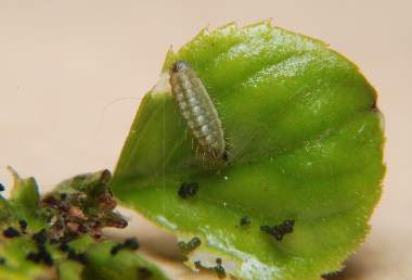 (参考) 摂食中の幼虫(コバノクロウメモドキ) 2010年3月4日撮影 静岡市駿河区 飼育 2009年12月 広島県 採卵 by I氏 小さな芽を湿ったティッシュの上に載せていますが、幼虫は少し葉の上をうろうろした後、表側から食べ始めました。頭部は向こう側で見えていません。糞が手前に見えています。 トップページへ |