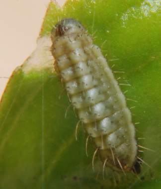 (参考) 摂食中の幼虫(1齢、コバノクロウメモドキ) 2010年3月6日撮影 静岡市駿河区 飼育 2009年12月 広島県 採卵 by I氏 首を伸ばして、葉表から葉裏の皮一枚残しながら囓っています。 トップページへ |