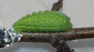 (参考) 摂食中の幼虫(3齢、9mm、コバノクロウメモドキ) 2010年3月21日撮影 静岡市駿河区 飼育 2009年12月 広島県 採卵 by I氏 頭部から尾部にわたる線がはっきり見えます。 トップページへ |