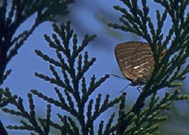 (参考) ヒノキの葉上に止まるウラミスジシジミ 2000年6月20日 大阪府能勢町三草山 ゼフィルスの聖地三草山でゼフィルスを探しているときに、不意に飛び出した個体です。私が見た唯一の個体です。残念ながら、いい位置に止まることなく、証拠写真程度ですが、それでも写せたので大変うれしかったものです。ケルシボルス型です。 トップページへ |