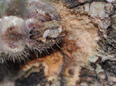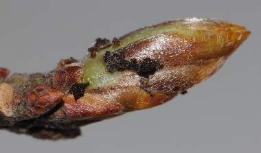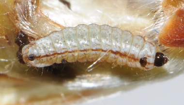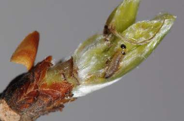 (参考) 芽の中に潜り込んだ幼虫(1齢、2.2mm) 2012年4月1日撮影 北海道稚内市 採卵 静岡市駿河区 飼育 芽に付けた幼虫はしばらくして完全に芽の中に潜り込んで全く見ることができません。黒い糞だけがだんだん増えていきます。そこで芽をだんだんと剥いてみました。トンネルを穿って食べている幼虫が出てきました。 トップページへ |