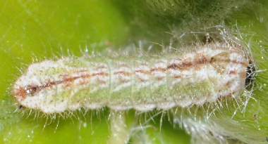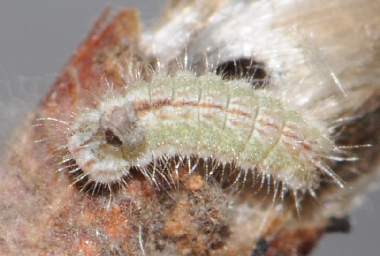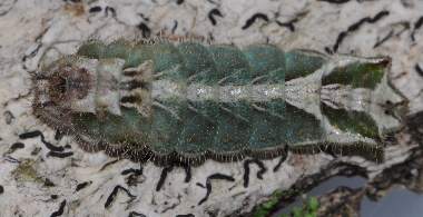 (参考) 新しい葉に擬態して隠れる幼虫(3齢、7.7mm) 2012年4月13、14日撮影 北海道稚内市 採卵 静岡市駿河区 飼育 コナラの新葉が展開してくると、薄緑の葉は少し茶色の感じもあります。その様子に幼虫が似ているように思えます。複数の葉で囲われた中に潜んでいます。2齢もそうでしたが、第一胸節には艶のある菱形の板のようなものがあります。ところで、同時に孵化した他の個体を1つの小さなタッパーで飼っていたところ、1匹を残して全て死亡しました。明らかに共食いで、痛い勉強になりました。 トップページへ |