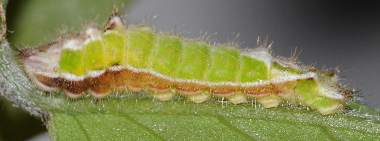 (参考) ウラミスジシジミの前蛹(12mm) 2012年4月24日撮影 北海道稚内市 採卵 静岡市駿河区 飼育 コナラの葉を動かして幼虫を観察したためか、囓っていた場所から移動して新たに少し囓ってから前蛹になりました。前蛹になると、幼虫の突起はなくなりました。 トップページへ |