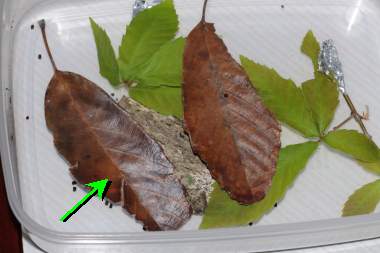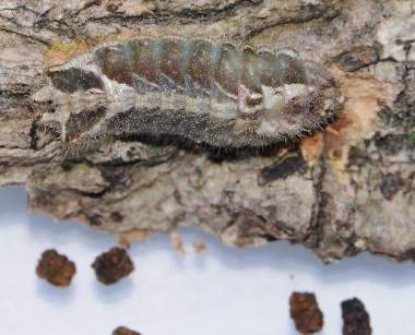 (参考) 樹皮を囓る幼虫(4齢、14mm) 2012年4月21日撮影 北海道稚内市 採卵 静岡市駿河区 飼育 2枚目の写真のように、飼育容器に餌の若いコナラの葉、蛹化用の枯葉、樹皮を入れていたところ、枯葉下のコナラの樹皮を囓っています。糞も、葉を食べていた時の黒い糞とは違い、茶色の糞をしています。 トップページへ |