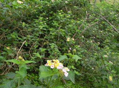 (参考) 葉上で休むホリイコシジミ(♂)とランタナの生える環境 2010年3月15日 沖縄県石垣島 辺り一面ランタナという場所です。本来牧場のようですが、この一角は放置されています。ランタナには細かな棘があり、牛は食べないようで残ったのでしょう。このときは発生の始まりで、数匹しか確認できませんでしたが、私にとっての初見となりました。秋には大発生するようです。 トップページへ |