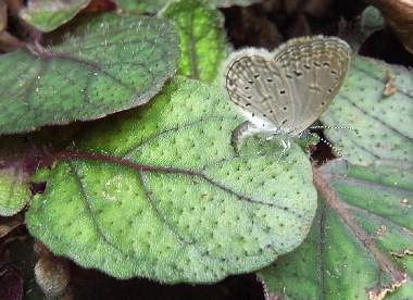 | ホリイコシジミは、八重山諸島でもまだ迷蝶とされていますが、毎年発生しており定着しているとも考えられます。翅の表裏ともにヤマトシジミ、(ヒメ)シルビアシジミ、ハマヤマトシジミに似ています。細かな区別点があるようですが、幼虫がランタナとシソモドキを利用するので、これらの近くにいる小さい蝶であれば、ホリイコシジミと考えて良いと思います。非常に小さいのですぐに目の前から消えてしまいますので、撮影はかなり大変です。なお、名前は意味からするとホリイ・コ・シジミと分けられ、ホリイは人名のようですが、詳細は知りません。コは小さいということです。ホリイコシジミは、日本では長い間クマツヅラ科ランタナ類だけを利用すると思われていましたが、2011年に、迷蝶として発生したイワサキタテハモドキの食草として有名になったキツネノマゴ科シソモドキなどを、ホリイコシジミも利用することが分かりました。蝶類生態図鑑によるとホリイコシジミは外国では広範囲の植物を利用するとされ、シソモドキに産むホリイコシジミは、ランタナを利用するものとは起源が異なるのかもしれません。 |