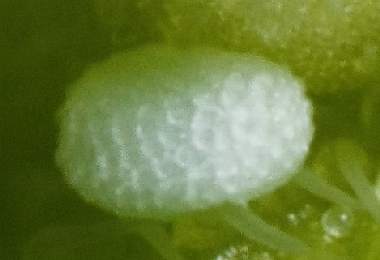 (参考) ホリイコシジミの卵(0.30mmΦ、ランタナ) 2011年11月23日 沖縄県石垣島 産 静岡市駿河区 飼育 上に示した卵を静岡に持ち帰ってマクロシステムで撮影しましたが、これでも卵が小さすぎてうまく模様を撮ることができませんでした。 トップページへ |