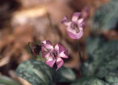 (参考) カタクリの花で日光浴するコツバメ 1989年4月6日 福井市 北陸地方は、ちょっと山地に入ればそこはカタクリの花の絨毯。ギフチョウの舞いに目を奪われながらも、地味なコツバメがカタクリに止まり自己主張をしているようです。 トップページへ |