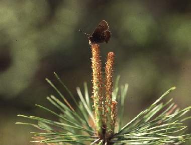 (参考) カタクリの花で日光浴するコツバメ 1991年4月17日 福井市 おそらく♂でしょう。松の枝先で日光浴しながら、テリトリーを見張っているのでしょう。日光浴するときは、太陽に垂直になるように翅を傾けます。最も効率よく太陽の光が受けられるからでしょうが、それには異論もあるようです。 トップページへ |