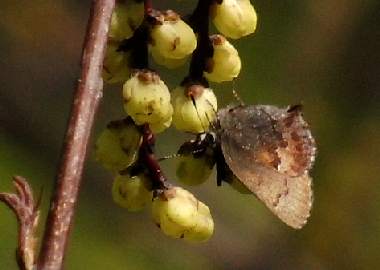 (参考) キブシの花で吸蜜するコツバメ 2010年5月3日 兵庫県豊岡市 口吻が見えないですが、執拗にこの花にいたので、おそらく吸蜜しているのでしょう。この前には、スギタニルリシジミも訪花していました。 トップページへ |