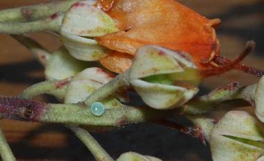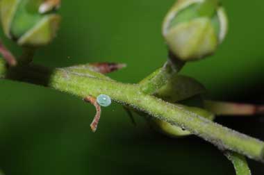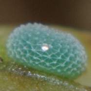 (参考) コツバメの卵(アセビ) 2010年5月3日 兵庫県豊岡市 非常につやつやした青いまんじゅうという趣です。トラフシジミの卵に近い感じです。 トップページへ |