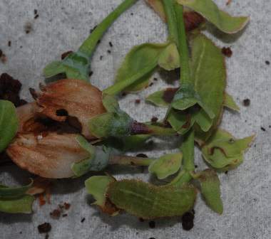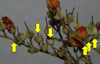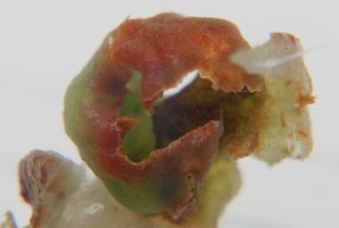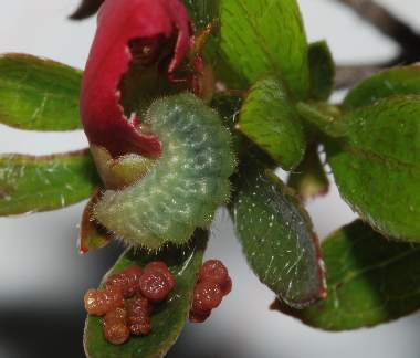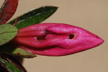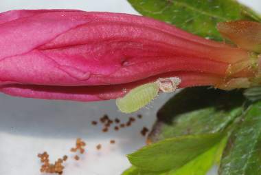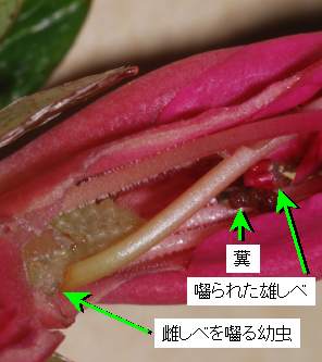 (参考) サツキの雌しべに食いつく幼虫(2齢、4mm) 2010年5月10日夜撮影 静岡市駿河区 飼育 兵庫県豊岡市 産 個体2:中に幼虫が入っているサツキの蕾です。花弁を剥がして中を見ると、雌しべの根元を囓っていました。 トップページへ |