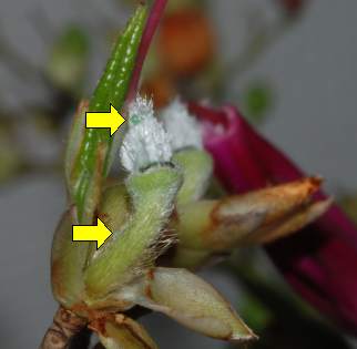 (参考) 脱皮直後の幼虫(3齢、4.5mm) 2010年5月12日朝撮影 静岡市駿河区 飼育 兵庫県豊岡市 産 個体2:蕾の外側で脱皮しました。古い頭部や皮が見えます。 トップページへ |
