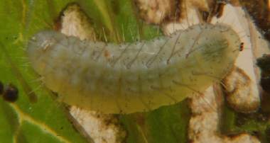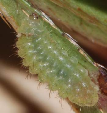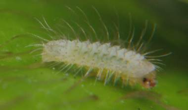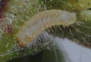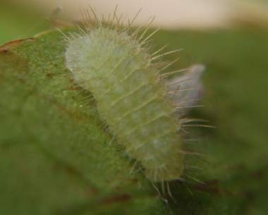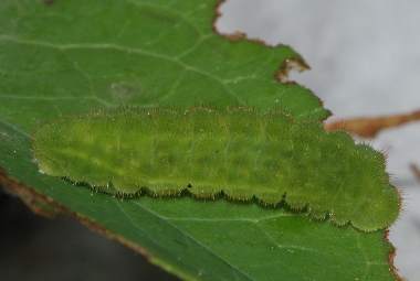 (参考) 徘徊する幼虫(2齢、4.5mm) 2010年5月11日朝撮影 静岡市駿河区 飼育 兵庫県豊岡市 産 個体2:葉の裏で歩いています。透明感のあるでこぼこの幼虫です。脱皮する場所を探しているようです。 トップページへ |