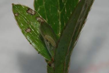 (参考) 歩き回るコツバメの幼虫(1齢、2.5mm)と食べ跡 2010年5月7日夜撮影 静岡市駿河区 飼育 兵庫県豊岡市 産 個体2:容器を歩き回っていたのでサツキの葉に移動させました。残ったアセビの実は中身がありません。 トップページへ |