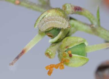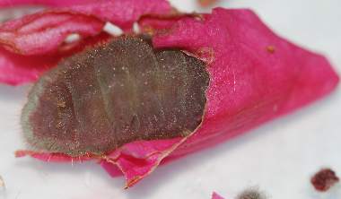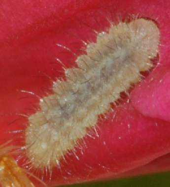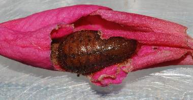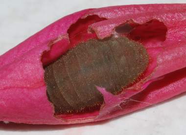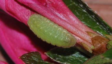 (参考) 幼虫(3齢、上6mm、下8mm) 2010年5月12日夜、13日夜撮影 静岡市駿河区 飼育 兵庫県豊岡市 産 個体2:最初蕾の中で、翌日は外から花弁や蘂を食べています。花弁や雄しべを食べて、それらの黒ずんだ色が透けて見えます。 トップページへ |