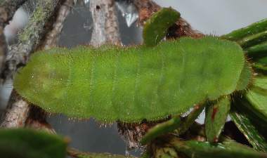 (参考) 幼虫(4齢、15mm、ブルーベリー) 2010年5月19、22日撮影 静岡市駿河区 飼育 2010年5月3日母蝶採集 兵庫県豊岡市 産まれた卵は全て孵化しました。おもにサツキで育てていますが、この写真はブルーベリーを与えたときの様子です。実が好きですが、葉も表皮を残して食べたり、縁をガリガリとよく食べています。サツキの柔らかい葉よりもずっと好きなようです。しかしどうも共食いも起こっていたようです。最後はサツキの蕾を与えました。結局、サツキの葉や容器底で蛹化し、10蛹得られました。 トップページへ |