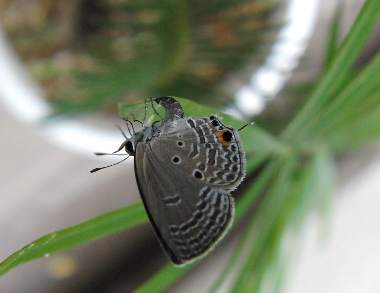 クロマダラソテツシジミは、もともとタイワンからフィリピンに生息し、ソテツを食する害虫に分類されるシジミチョウです。2007年秋に我がバタフライガーデンで新鮮な♂が見つかりました。しかしこの年は大阪市の記録はほとんどありませんでした。ところが2008年には兵庫県と大阪府ではかなり広く見られるようになり、我が家でも発生してしまいました。それも2007年にベランダの鉢に種を植えて今年になって伸びたソテツの少し固くなった芽に卵を産んだのです。その卵や幼虫を見たときにはちょっと背筋が寒くなりました。これはいったい何を意味しているのか。その後、その日には♀が何度も卵を産み、庭のニラでは♂が吸蜜していました。このページはそれらの記録です。2009年にも大阪市をスタートに発生し、我が家にもやってきました。東京都でも発生したそうです。 クロマダラソテツシジミ1へ。 |