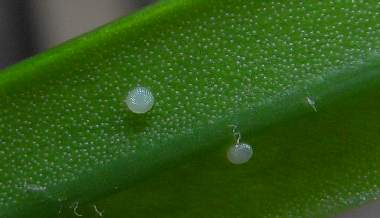 2008年8月30日 大阪市淀川区 自宅ベランダの少し小型の♀です。産卵しているソテツは、今年の夏に芽を出してかなり固くなりかけているものです。葉の裏には既に多くの1、2齢幼虫と卵殻が付いています(後述)。 トップページへ |