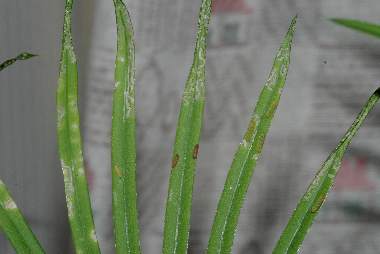2008年8月30日 大阪市淀川区 去年の秋に土に埋めた2個の種と1個の側芽から伸びた葉です。側芽からの葉は既に固くなっており卵も幼虫もいませんが、種子から伸びた葉はまだ少し柔らかく、裏側に多くの卵と幼虫がいます。葉全体の高さは28cm、1枚の葉の長さは9cmぐらいです。 トップページへ |