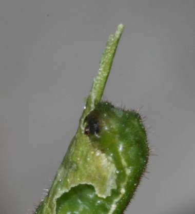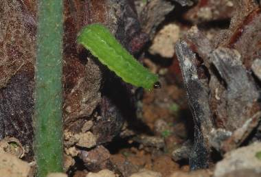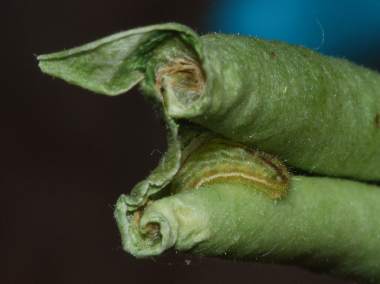 インゲン豆のさやに食いついた幼虫(3齢)